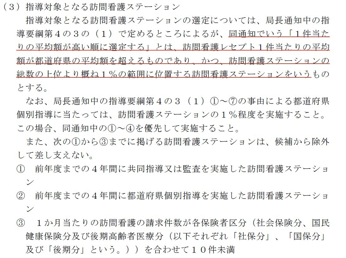 訪問看護のレセプト平均額による個別指導について、都道府県の平均額を超え、かつ上位1%を対象とすることが明示されました。