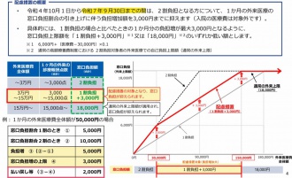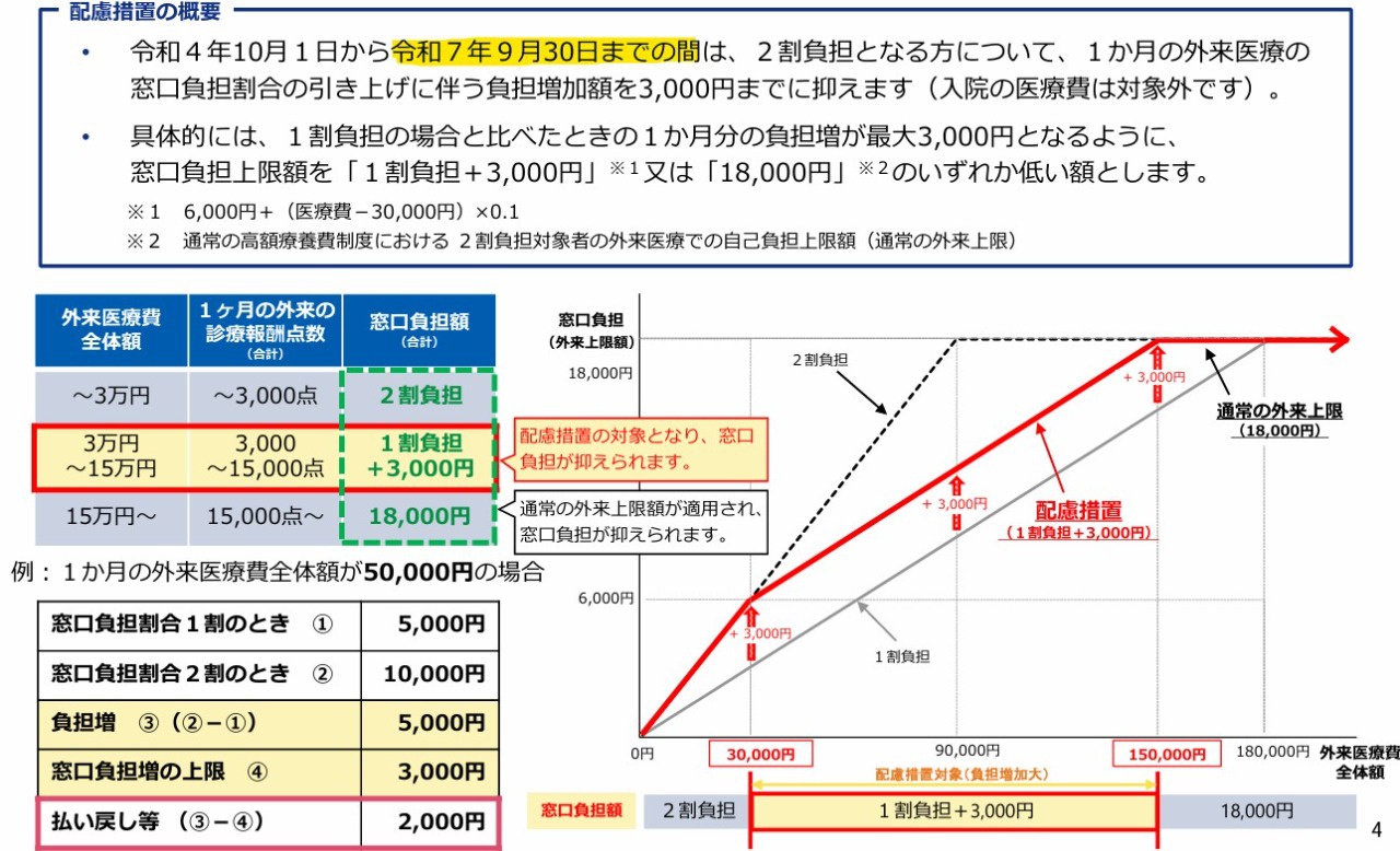 令和4年10月に変更になった一定所得以上の後期高齢者への外来負担について、その急激な変化を押さえるために「配慮措置※」が設けられています。(※1割+3,000円)
